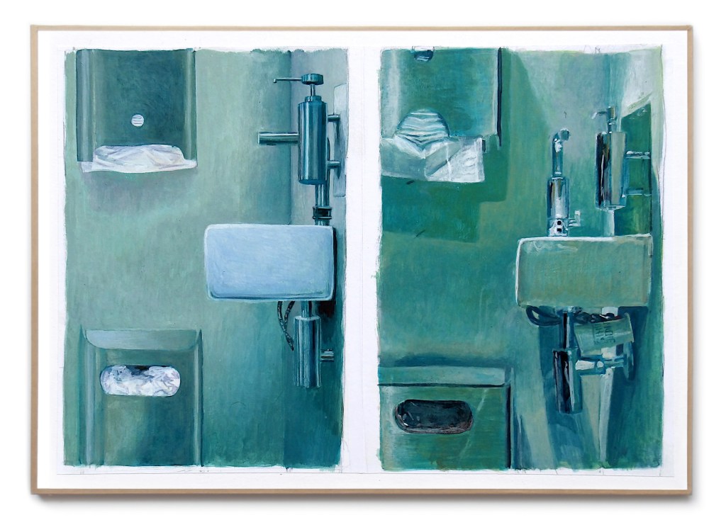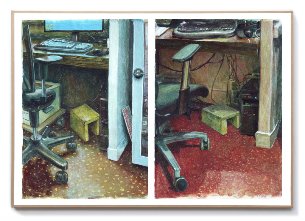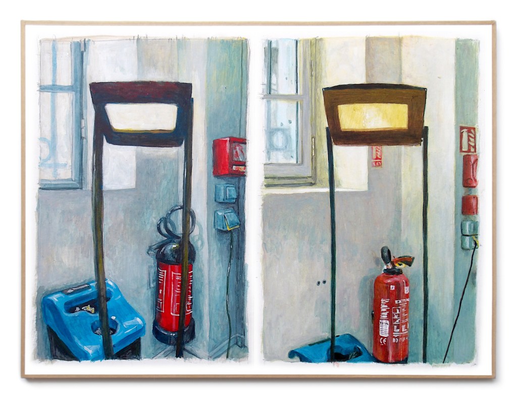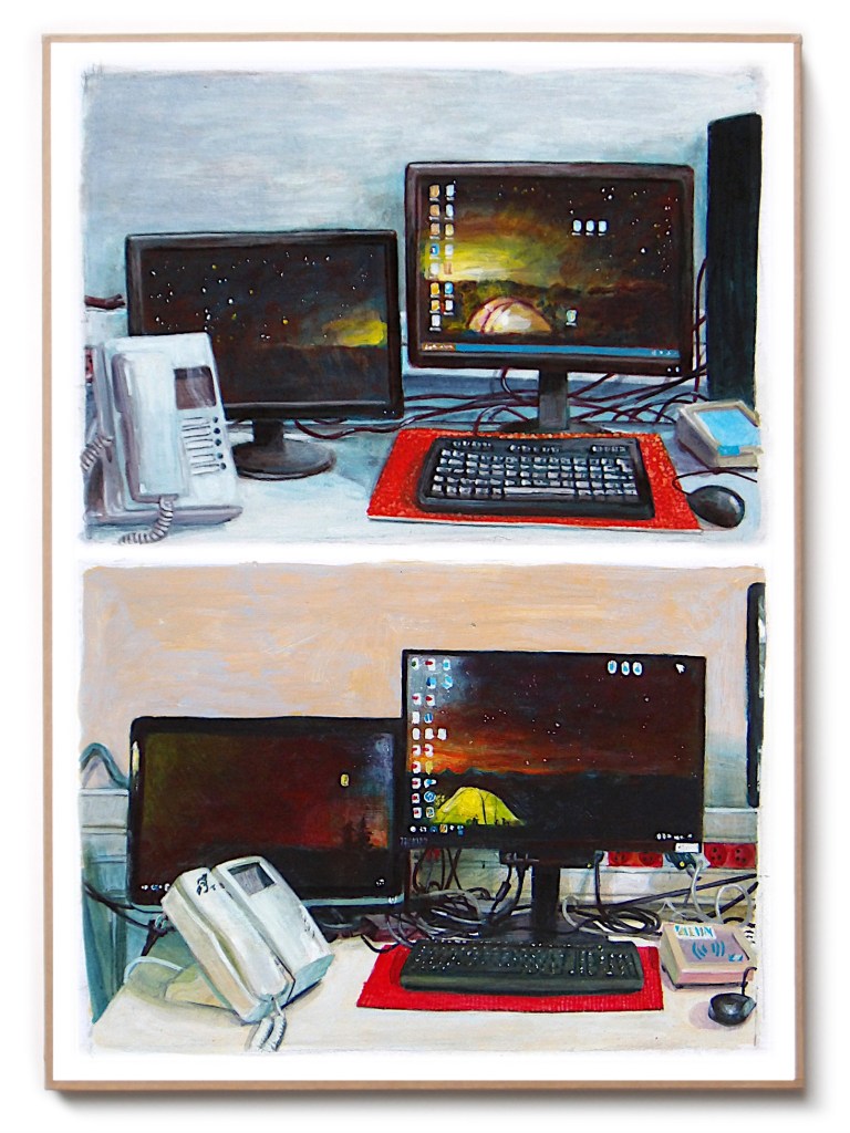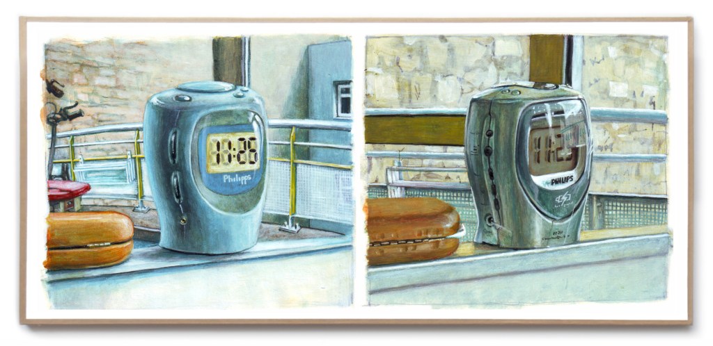 Les objets sont du quotidien, des natures mortes, comme on dit, mais de l’ère industrielle. Bouilloire électrique, ordinateur, réfrigérateur, brosse à dents et autres, autant d’artefacts issus de l’ingéniosité humaine passés au tamis de l’œil du peintre. Rien n’est compliqué, tout est détail. Les couleurs mêmes chatoient de façon différentes entre les deux versions de chaque pièce. Il faut s’en user le regard.